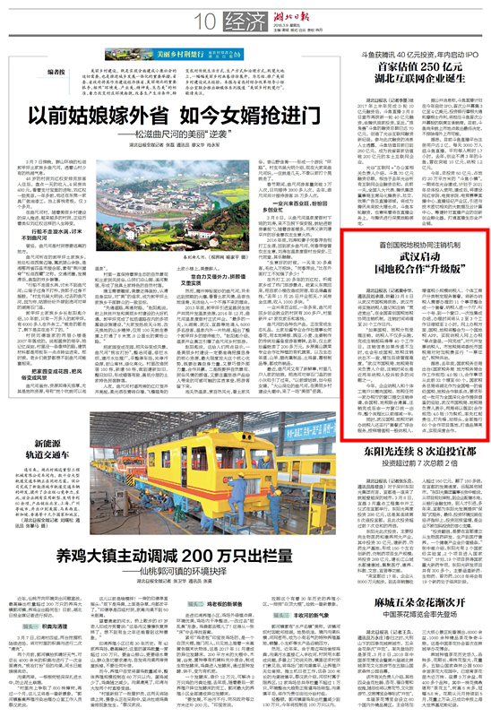据悉,去年底,国家税务总局出台《国家税务局地方税务局合作工作规范(4.0版)》,合作事项从此前32个增至60个。国家税务总局将湖北作为全国唯一的省级国税、地税合作联系点,要求形成一批可为全国深化合作提供借鉴的经验。武汉市国税局、地税局负责人表示,两局将以落实《合作规范(4.0版)》为契机,率先扛起责任,打先锋、站排头,全面推行60个合作项目落地,打造品牌亮点,实现深度合作。