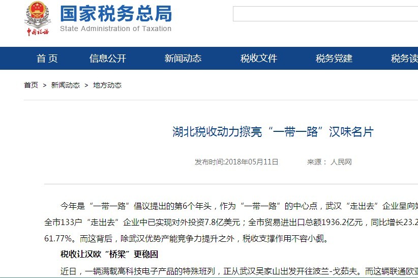 今年是“一带一路”倡议提出的第6个年头,作为“一带一路”的中心点,武汉“走出去”企业呈向好趋势。2017年,武汉全市133户“走出去”企业中已实现对外投资7.8亿美元;全市贸易进出口总额1936.2亿元,同比增长23.2%,占湖北省比重高达61.77%。而这背后,除武汉优势产能竞争力提升之外,税收支撑作用不容小觑。